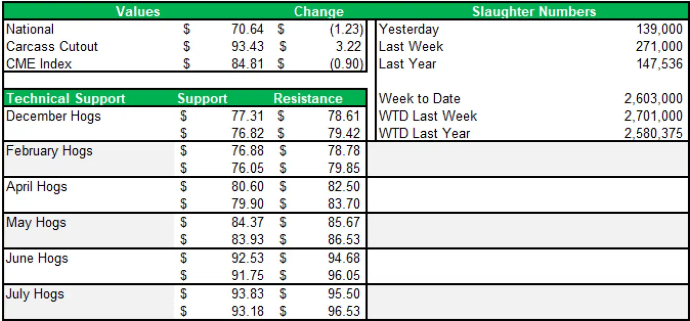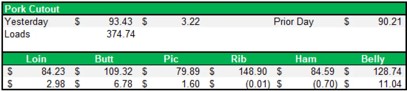 - The pork carcass cutout which fell for most of the week, turned higher as the belly primal recovered much of the sharp pullback seen on Thursday.