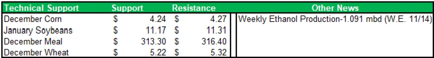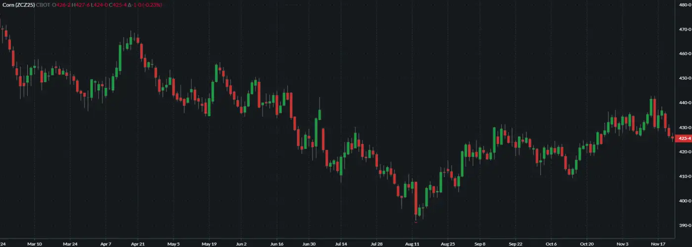 - Dec corn settled at $4.255 down $0.01 with March 26 down $0.0025 at $4.375.