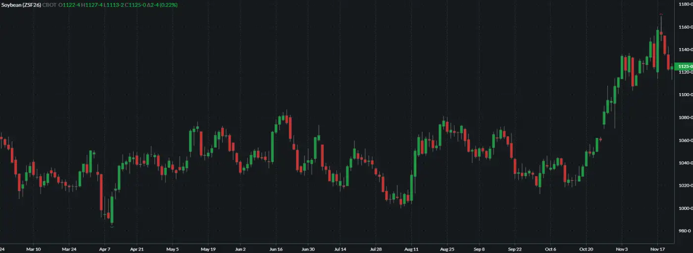 - Jan soybeans were up $0.025 at $11.25. Nov 26 was down $0.0225 at $11.3425.