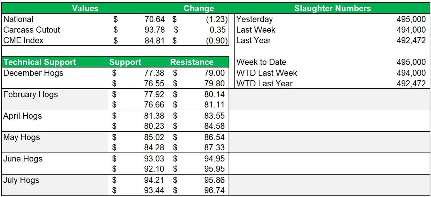 - Strong production continues with slaughter pace starting the week at an estimated 495K, up 1K from last Monday and up approximately 2.5K from last year.