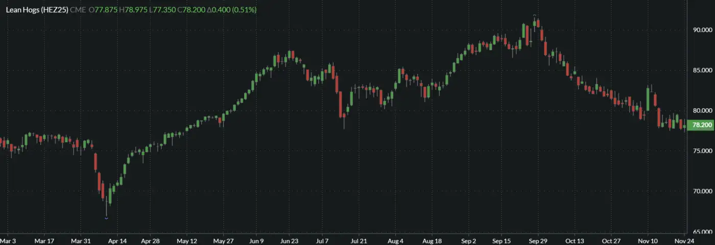 - Lean hog futures finished higher across the board today with front month Dec up $0.40 at $78.20 and the deferred months up $0.50 to $1.475.