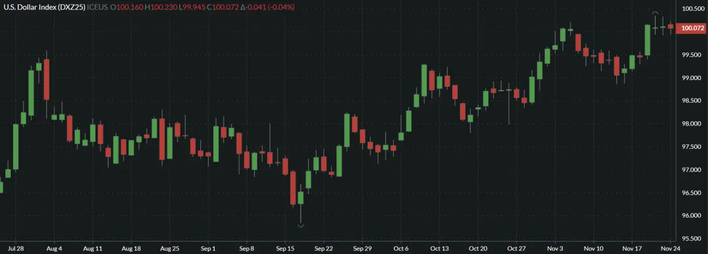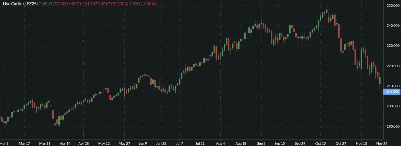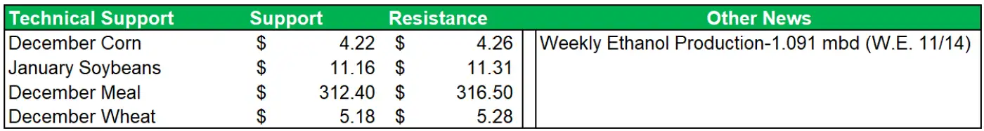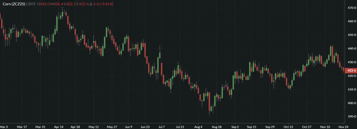 - Dec 25 corn settled at $4.2375 down $0.0175, while Dec 26 held steady at $4.60.