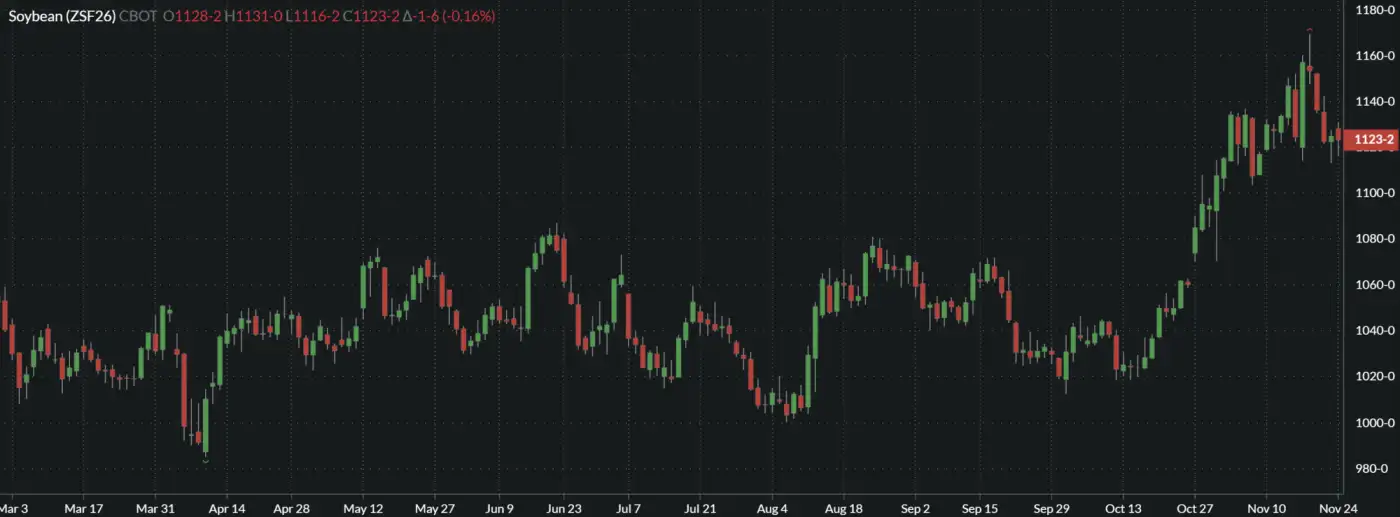 - Jan soybeans were up $0.0175 at $11.2325, and Nov 26 was up $0.0475 at $11.1675.