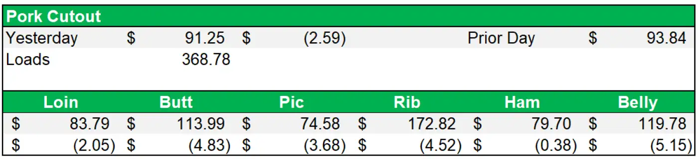 - The pork cutout broke lower from the sideways range it’s been trading and finished at $91.25 down $2.59 on the day.