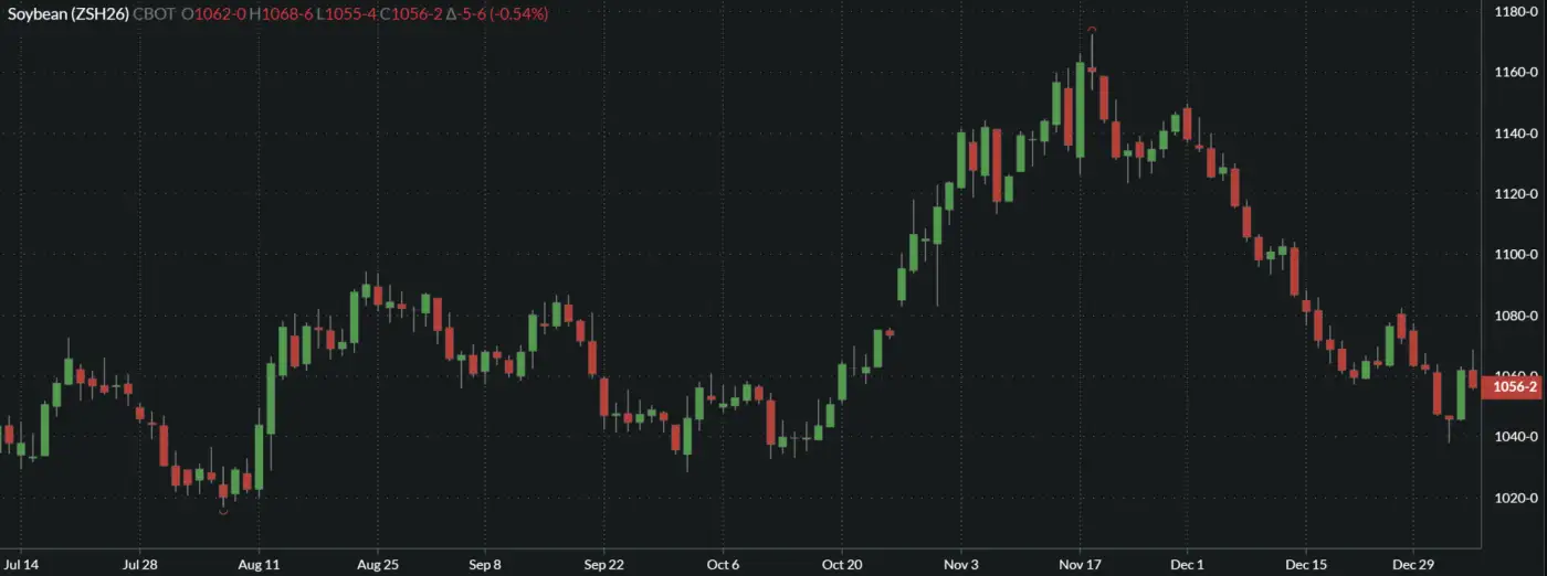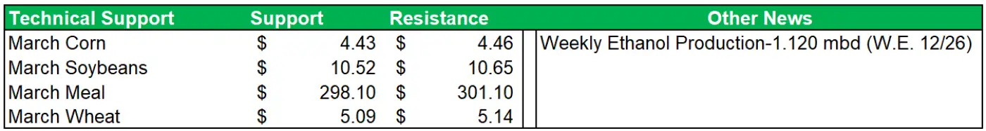 - After yesterday’s sharply higher trade, soybean futures also traded both sides of unchanged before ultimately ending the day lower and near the session lows. March closed at $10.5625 down $0.0525, and the May-Sep contracts were down $0.0625 to $0.0775.