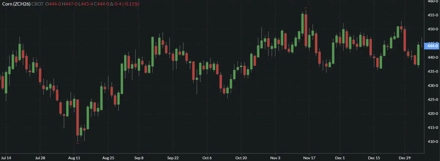 - Corn futures traded both sides of unchanged on Tuesday before settling slightly lower vs the previous day and near the session lows. Front month March was down a half cent at $4.44, and the May-Sep contracts were down $0.0075 to $.015.