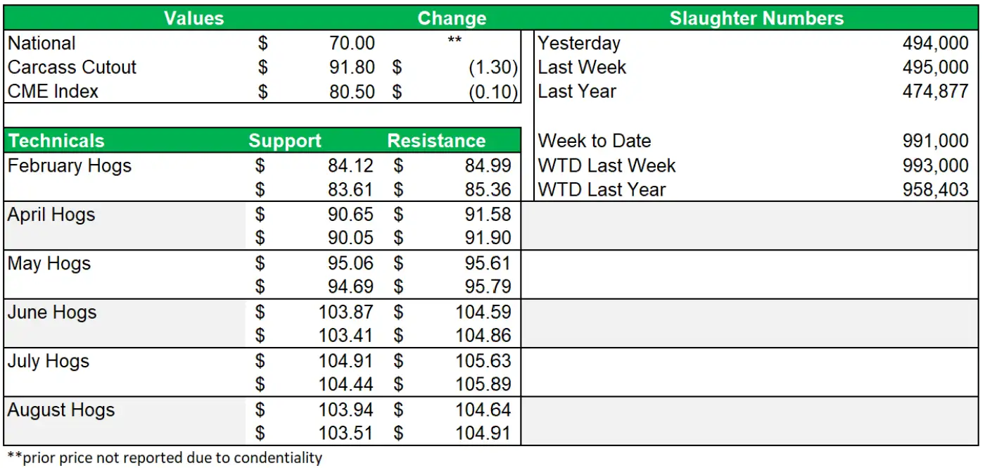 - Lean hog futures finished mixed on Tuesday with Feb up $0.20 at $84.625 and the Apr-Oct down $.475 to up $0.50.