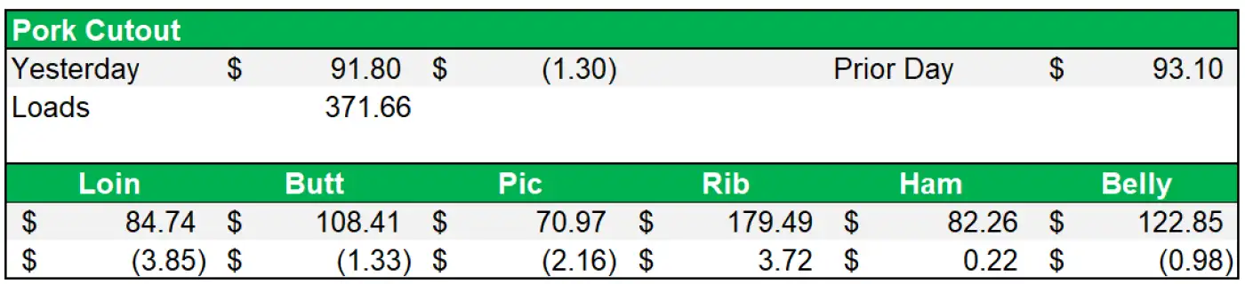 - The pork cutout was down $1.30 on Monday afternoon at $91.80.