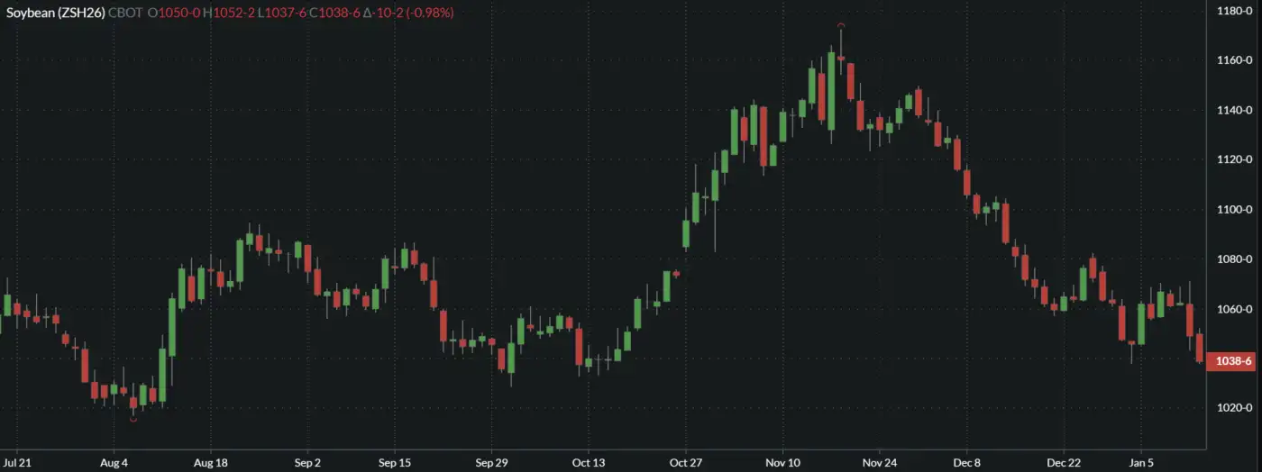 - Soybeans also traded lower on Tuesday with March down $0.1025 at $10.3875, while the May-Sept contracts were $0.09 to $0.0975 lower.