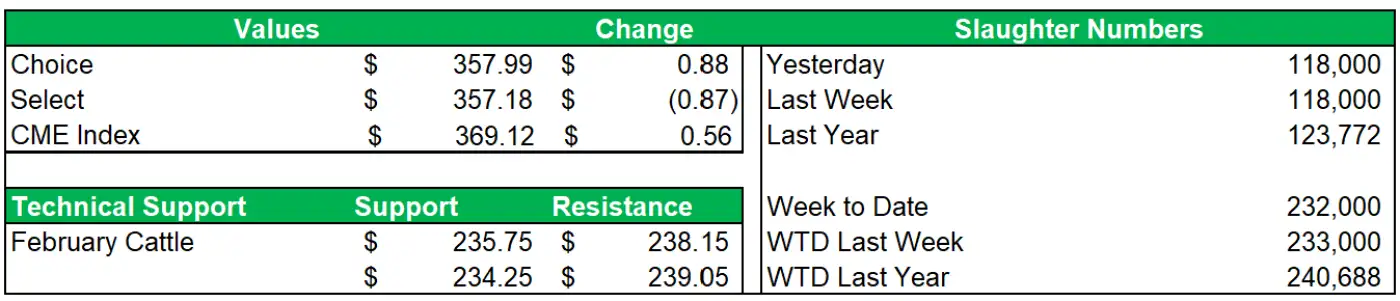 - Boxed beef was mixed with choice up $0.88 at $357.99 and select down $0.87 at $357.18.