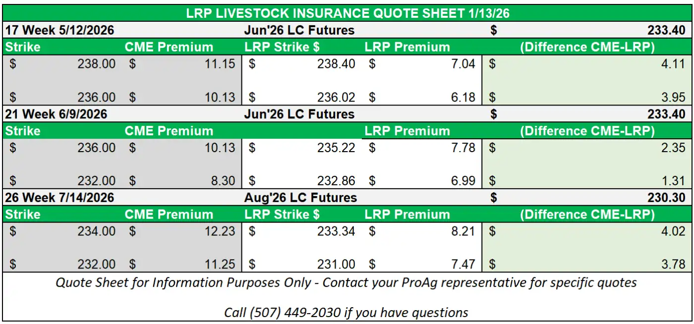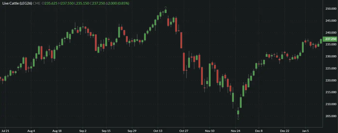 - Live cattle futures continued to push higher on Tuesday, closing at their highest levels since mid-October. Front month Feb was up $2.00 at $237.25, while the Apr-Oct contracts were up $2.55 to $2.90.