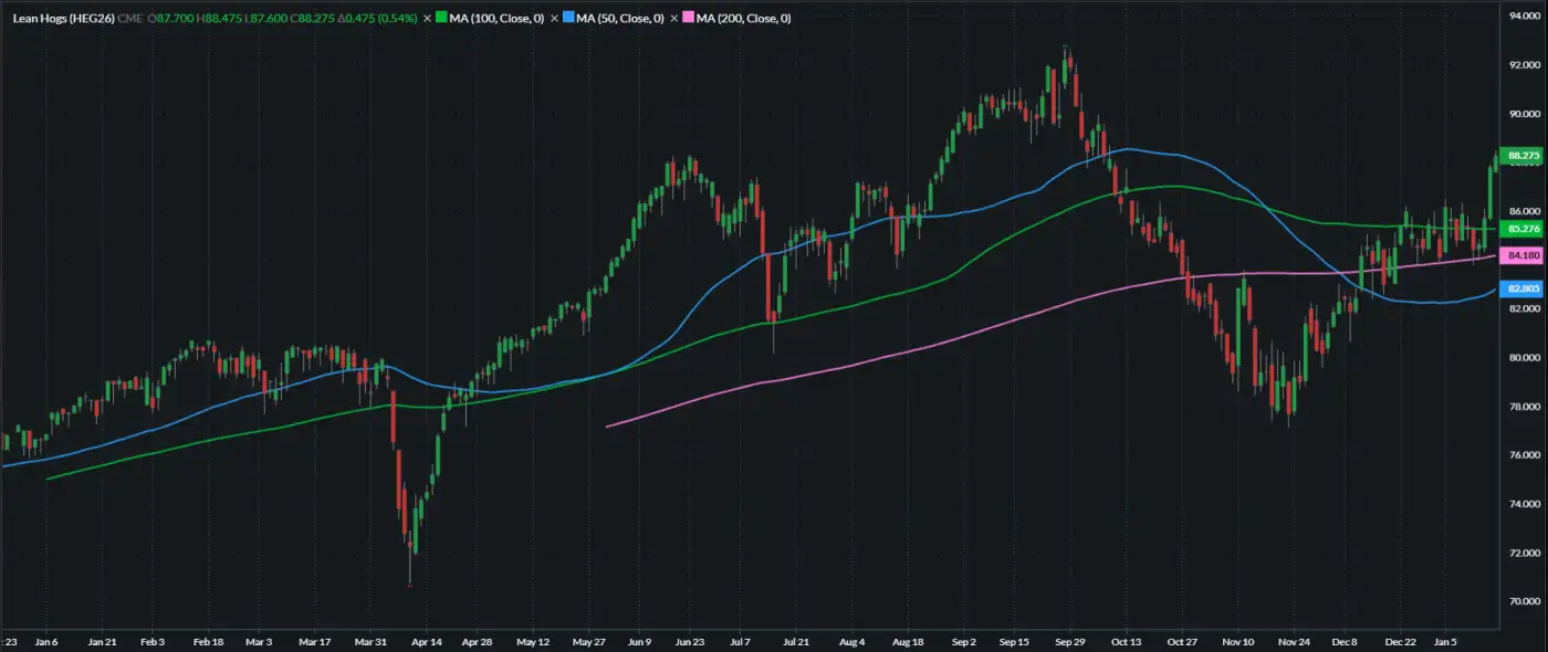- Hogs continued to the upside for the 4th straight day Friday putting a new high on the April contract at 95.975.