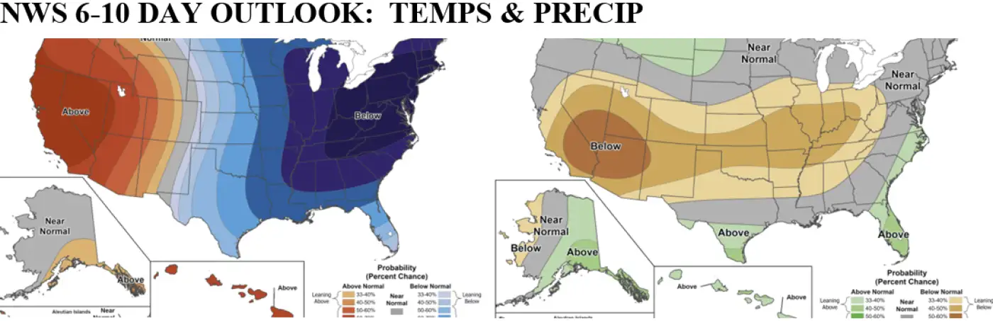 - The long weekend was mostly dry in the U.S., save for scattered snow showers in the Midwest and rains in the Southeast; a cold snap is setting in this week, with temps below zero at present in the eastern Dakotas, MN, IA, WI.