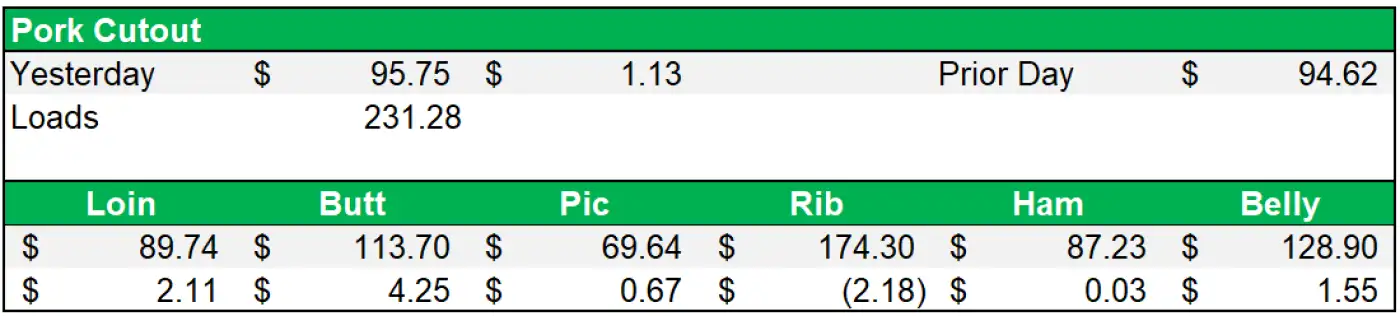 - The pork cutout finished the week at $95.75, up $1.13 on the day and up $2.12 on the week.