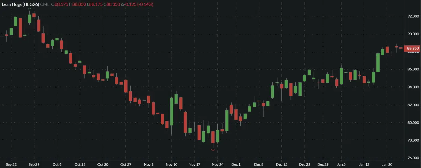 - All hog futures contract months finished higher on Friday versus last week as the overall trend remains higher. Every month except Feb 26 closed at new contract weekly highs. Front month February finished the week at $88.35 up $0.075 for the week, with April-August up $0.825-$1.85 on the week.