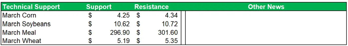 - Grains and oilseeds finished higher on Friday capping off a strong week. March corn settled at $4.305 up $0.065 and the May-Sep contracts gained $0.0425 to $0.0575