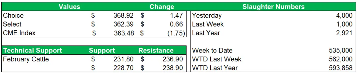 - Boxed beef was higher on Friday with choice up $1.47 at $368.92 and select up $0.66 at $362.39.