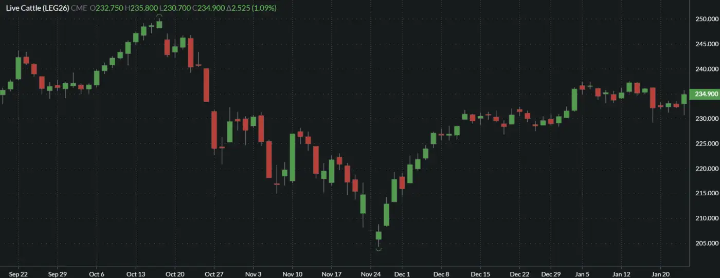 - Front month Feb settled at $234.90 on Friday, up $2.525 on the day, and up $2.75 on the week. The Apr-Oct contracts were up $2.575 to $2.95 on the week. Although higher on the week, live cattle futures are still trading below the January highs