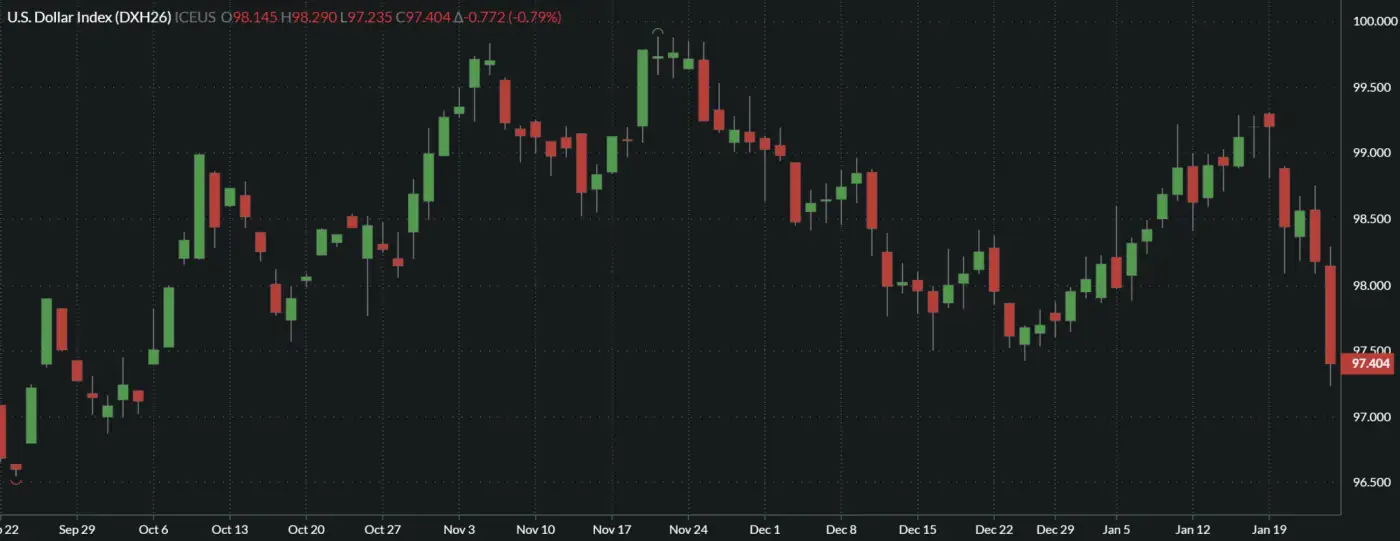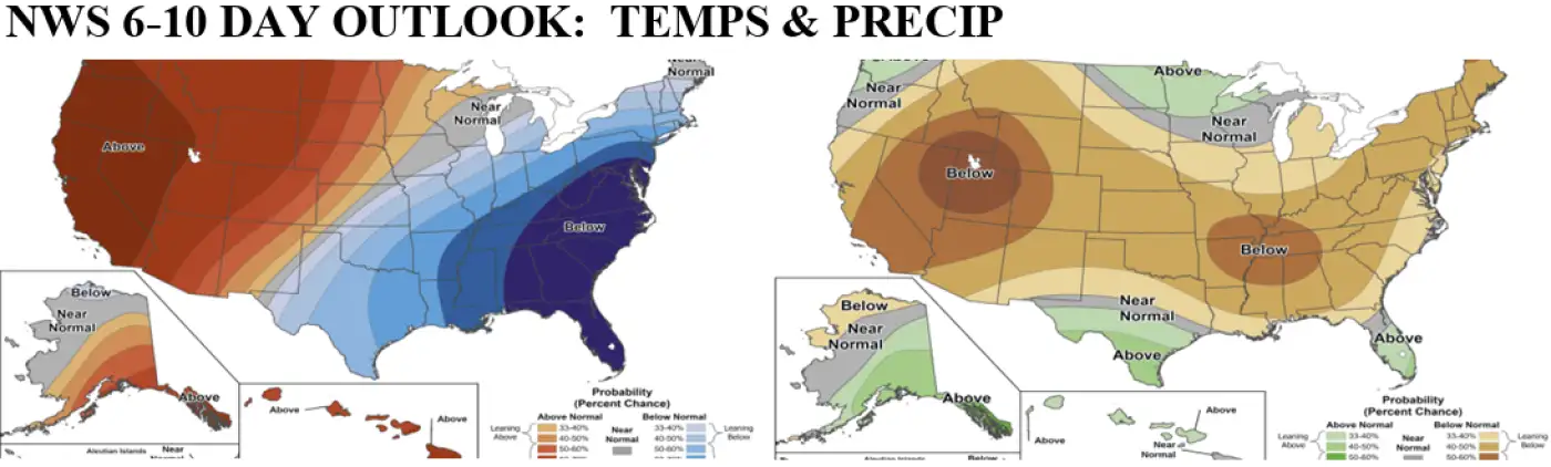 - Heavy rain, snow, and ice fell across the southern and southeastern U.S. over the weekend as expected, likely resulting in some winterkill in the Plains but also beneficial snow for winter wheat areas as well. Conditions look drier again going forward, up through at least the first week of February. Temperatures will move to a warm west/cold east pattern over the next two weeks.