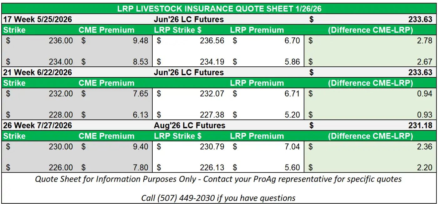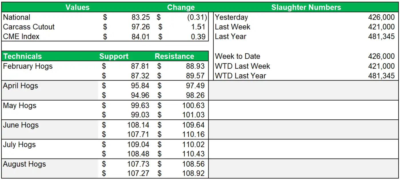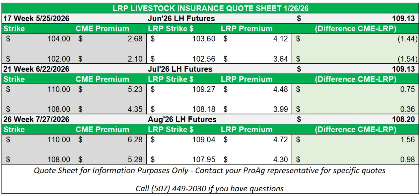 - The April forward contracts continue to push into new life of contract highs with the 2026 pork balance sheet expected to be historically tight with large production forecasts being offset by large demand expectations.