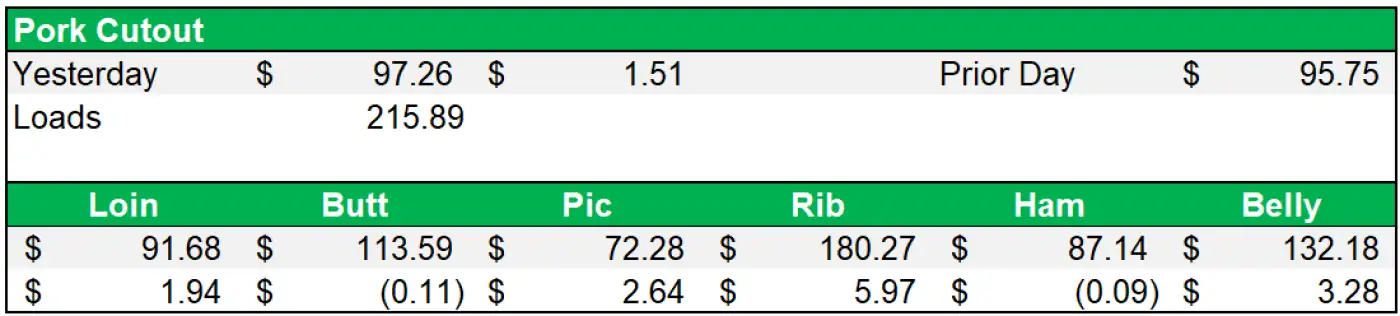 - The pork cutout posted at $97.26 on Monday afternoon, up $1.51.