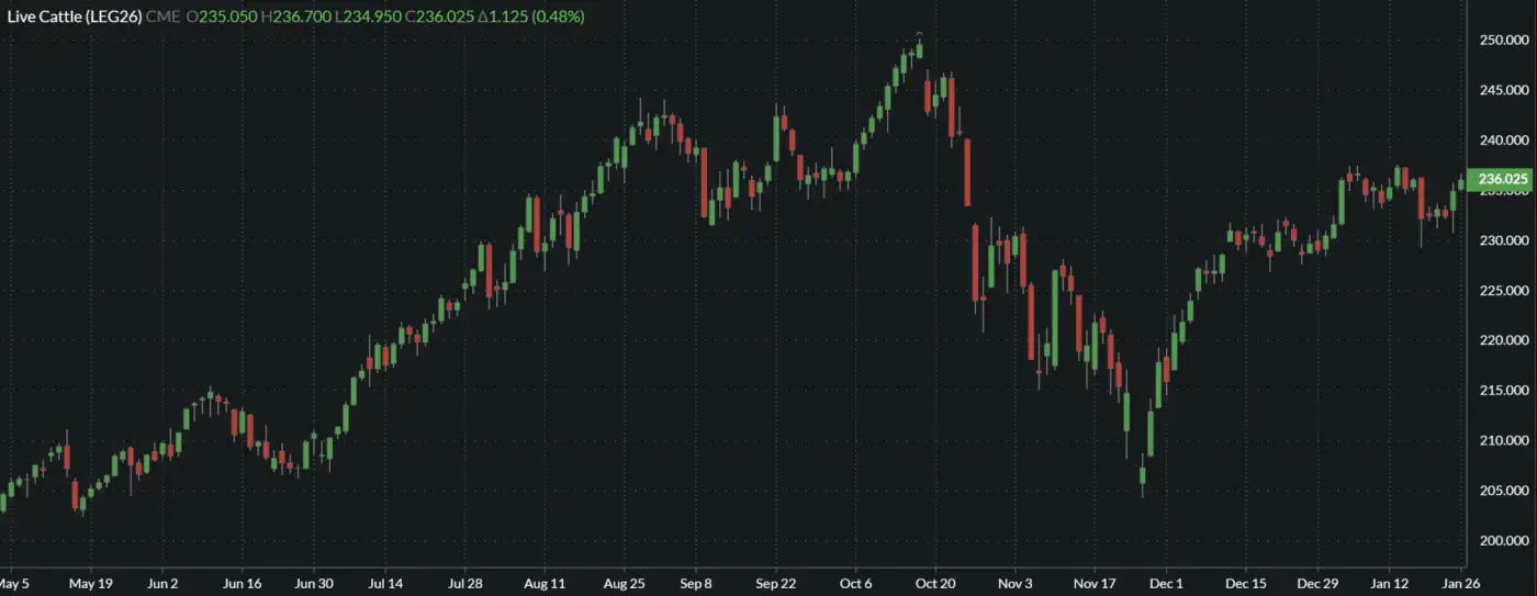 - Front month Feb settled at $235.025, up $1.125. The Apr-Oct contracts were up $1.075 to $1.25.