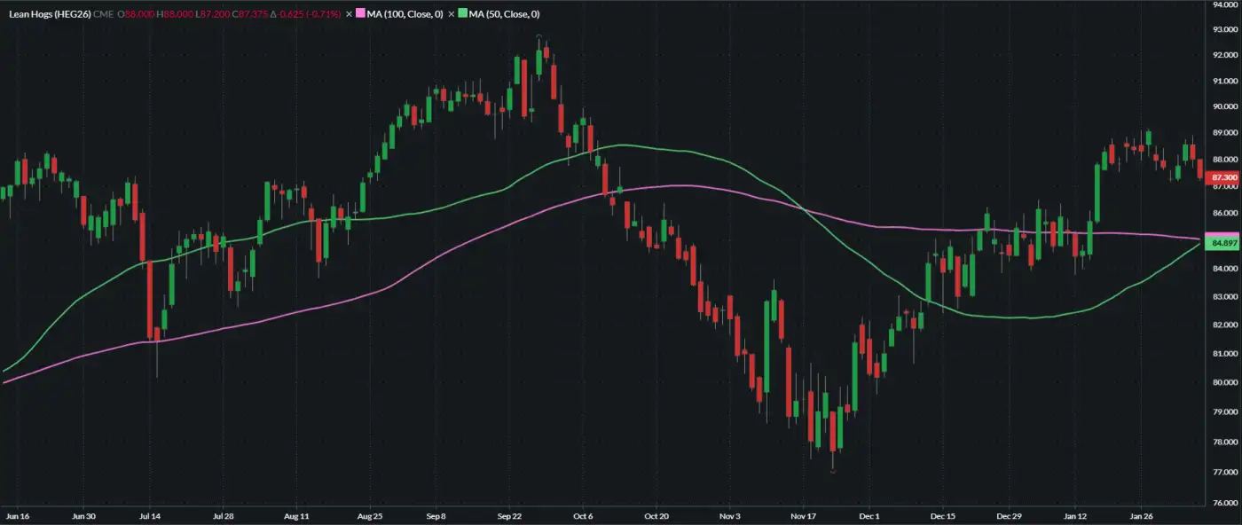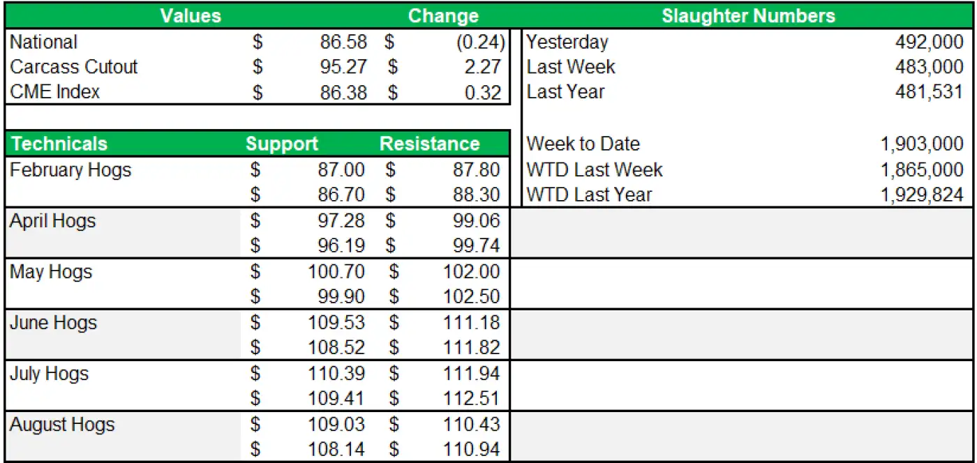 - Even though cash hogs were slightly firmer, rising open interest and repeated failures at the 99.80 level suggest the market may be nearing a technical top as funds consider trimming long positions.