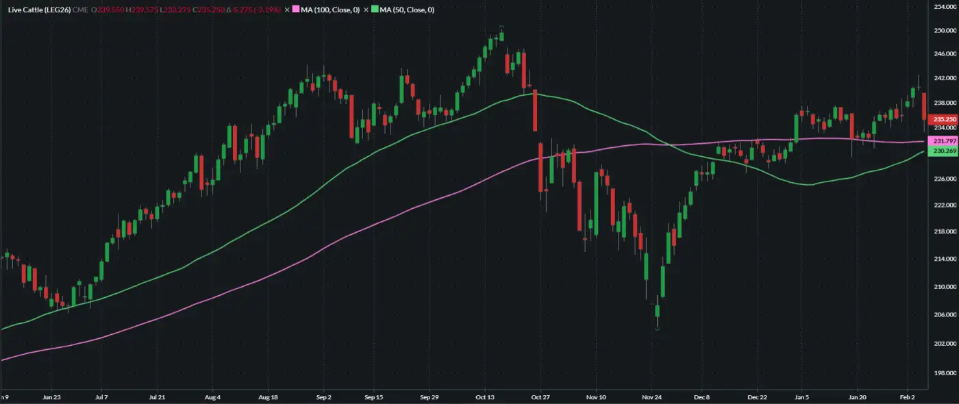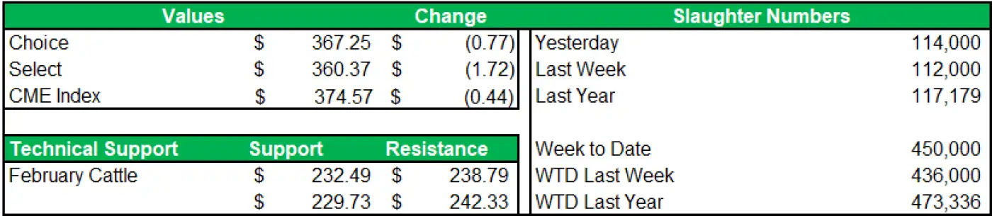 - Yesterday cattle opened sharply lower and the Feb Live Cattle closed down $5.275 and March feeder cattle ended the day down $6.000.