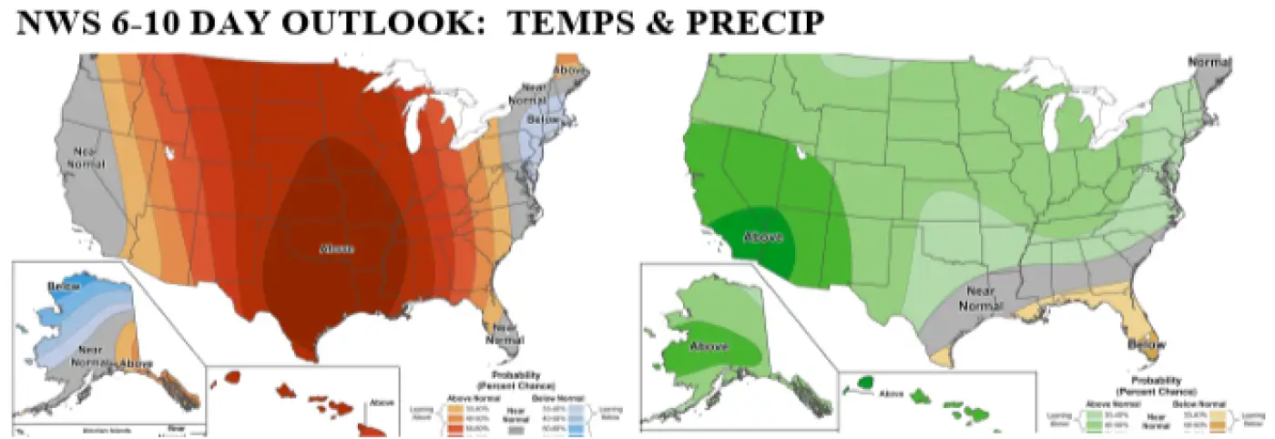 - The Plains and corn belt remain dry through early next week but extended maps continue to show above-normal precipitation; temperatures will stay on the high side of normal right through the middle of the month.