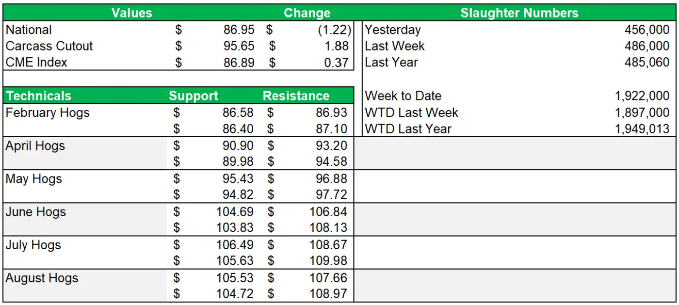 - Lean hog futures continued to slide lower with April having now lost $9 from the high made just 8 days ago. April settled at $91.825 down $2.025 while the Jun-Dec contracts were down $1.20 to $2.025