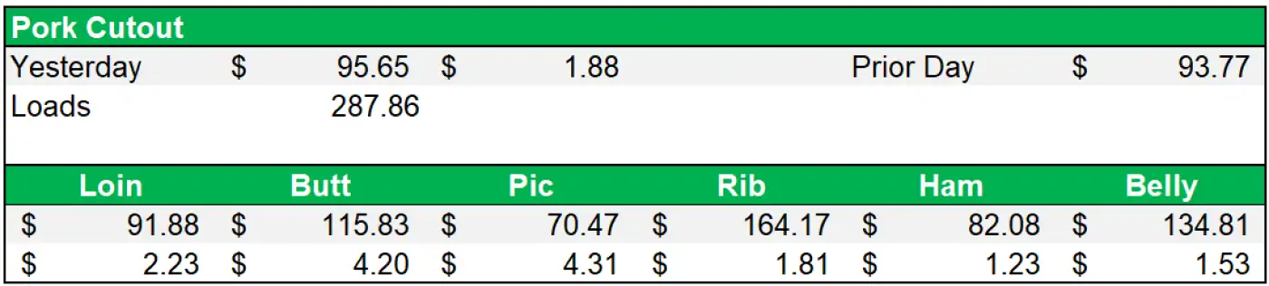 - The pork cutout continues to trade in a sideways range, gaining $1.88 on Thursday, up $1.88 from the previous day.