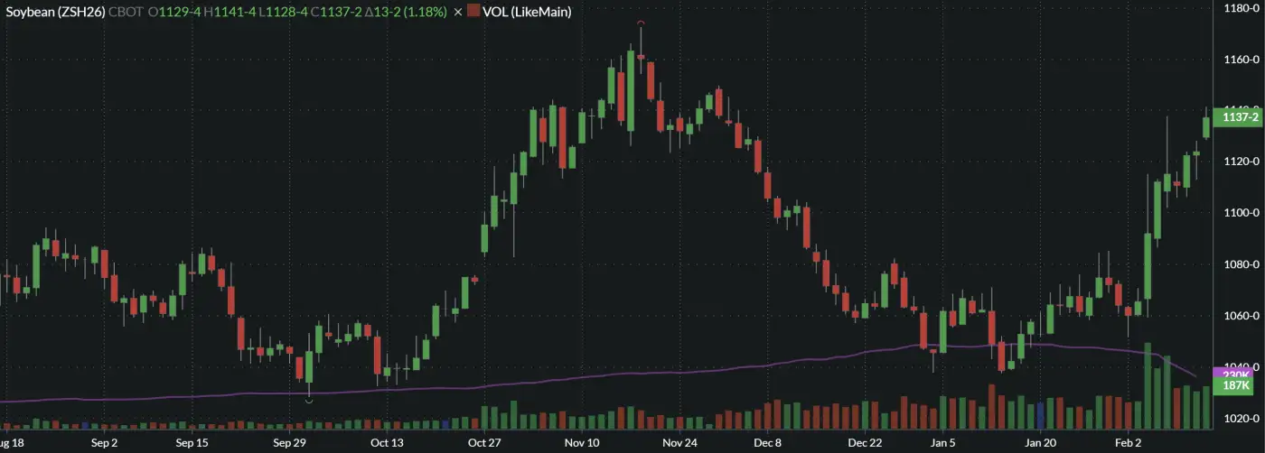 - Soybean export sales for the week ending 2/5 came in at 10 million bushels bringing the accumulated total to 1.27 billion, which is down 20% from last year.