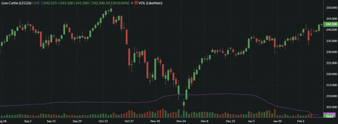 - Cattle futures ended mixed on Thursday. Feb closed at $242.50 up $0.15 and the Apr-Oct contracts were down $0.05 to $0.325.