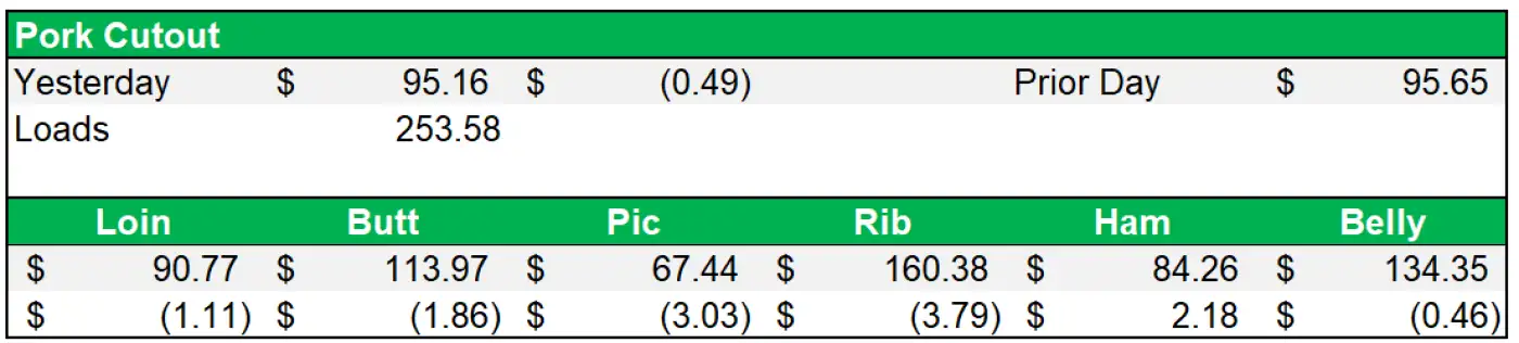 - The pork cutout continues to trade in a sideways range as well, losing $0.49 on Friday ending the week at $95.16.
