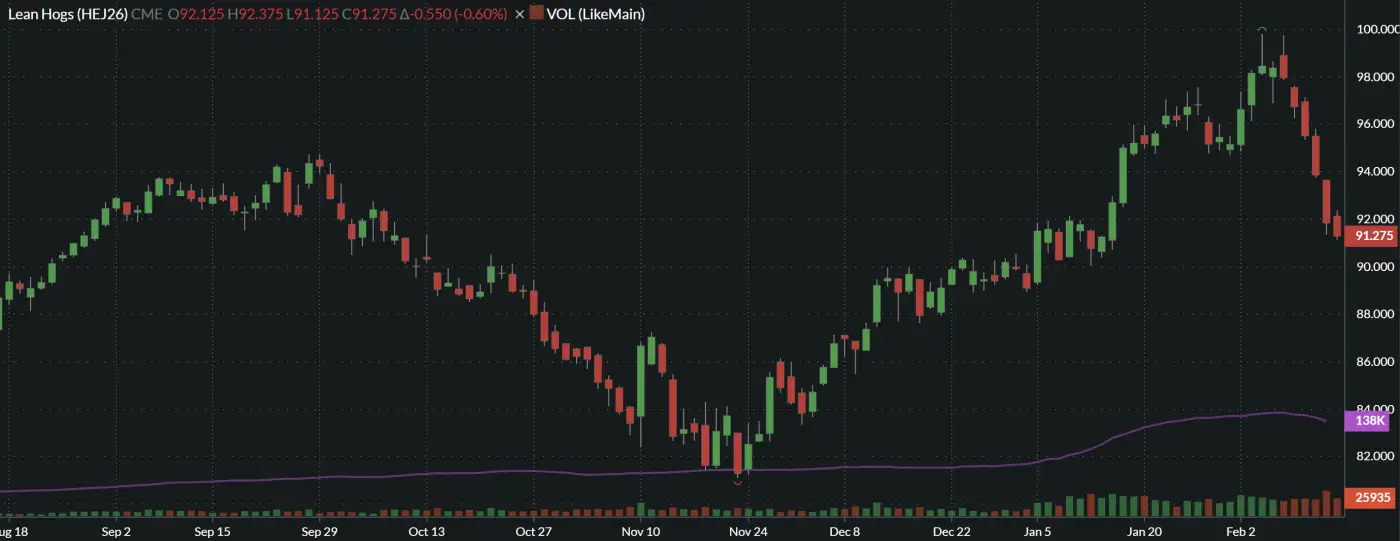 - Lean hog futures closed lower for the 6th day in a row on Friday. April settled at $91.275, down $0.55 while the Jun-Dec contracts were down $1.00 to $1.20. The sharp drop in futures is creating a historically strong basis vs the April contract which could provide futures price support as the cutout and negotiated hog market have been relatively steady.