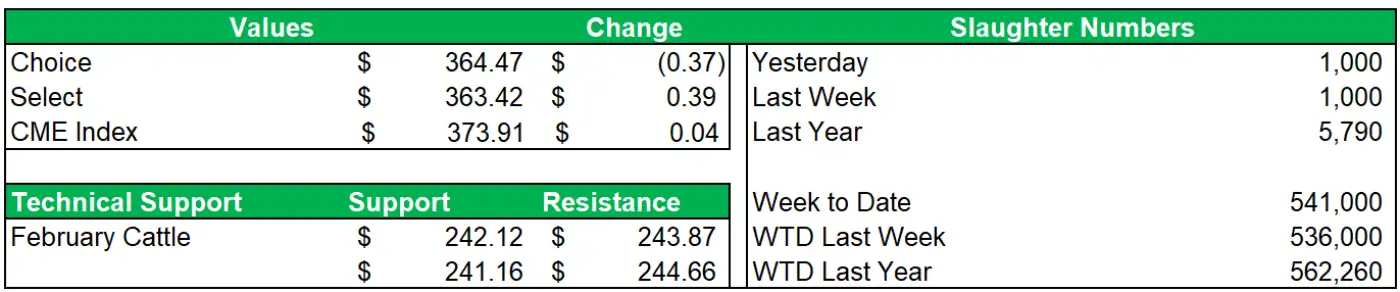 - Cattle futures settled mixed on Friday despite firmer negotiated trade. Front month Feb closed at $243.075 up $0.575, and the Apr-Oct contracts were down $0.025 to $0.40.