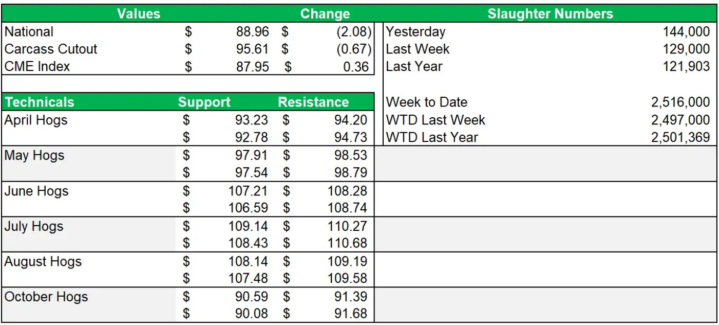 - Lean hog futures closed higher each day this week and recovered some, but not all of last week’s sharp losses. April closed at $93.675 on Friday up $0.225. The Jun-Dec contracts were up $0.65 to $0.875.