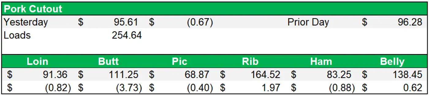 - The pork cutout ended the week still within the same mid-$90’s range it has been fluctuating in for the last couple of months. The cutout was $95.61 on Friday afternoon, down $0.67 from the previous day.