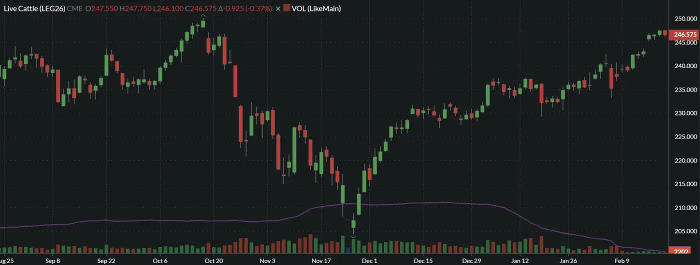 - Cattle futures were lower on Friday despite firmer cash trade. Front month Feb was down $0.925 at $246.575, and the Apr-Oct contracts were down $1.125 to $1.425.