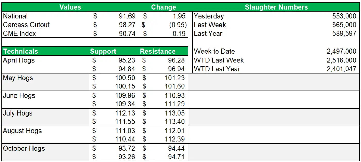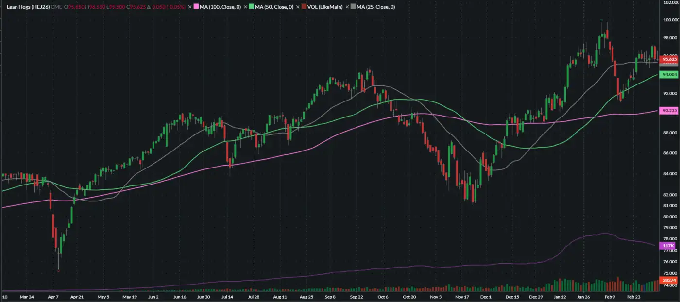 Lean hog futures were mixed on Friday afternoon with front month April down $0.05 at $95.625 and the Jun-Dec contracts up $0.30 to $0.675.
