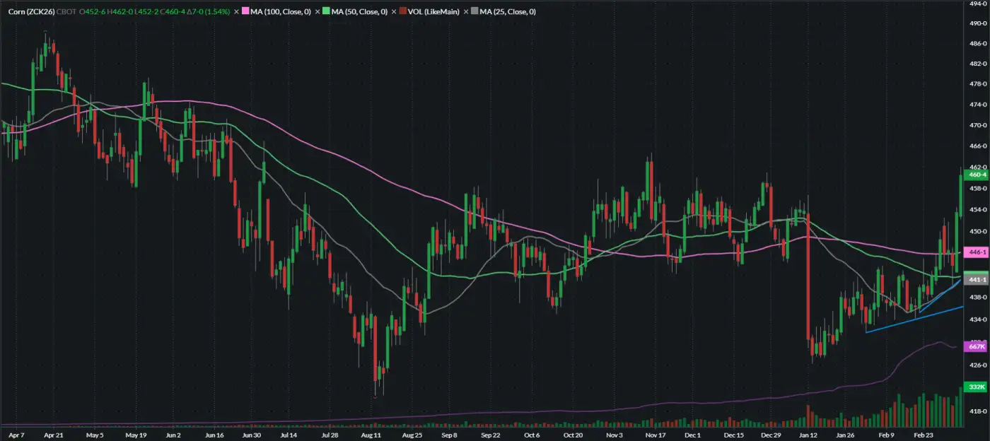 Corn futures gapped higher on the open Sunday evening following surging crude oil prices resulting from shipping concerns in the Strait of Hormuz. March corn is up a dime at the time of this writing. The May-Sep contracts are up $0.12 to $0.1275.