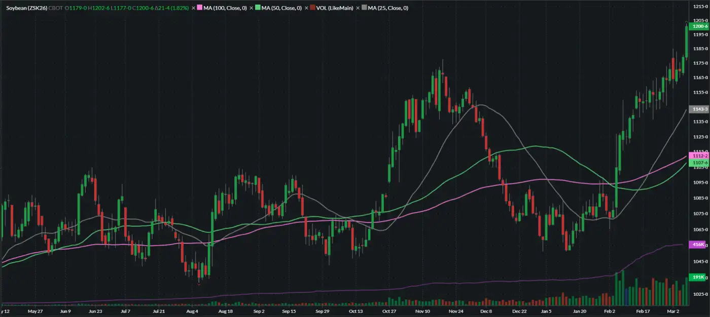 Soybean futures are also sharply higher on Sunday evening with March up $0.28 at $12.13 and the May-Sep $0.22 to $0.27.