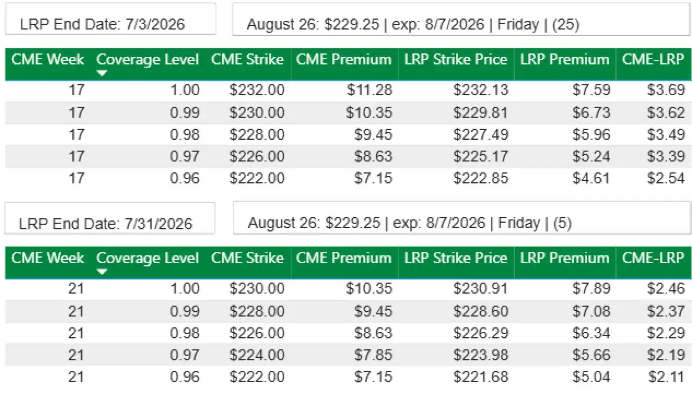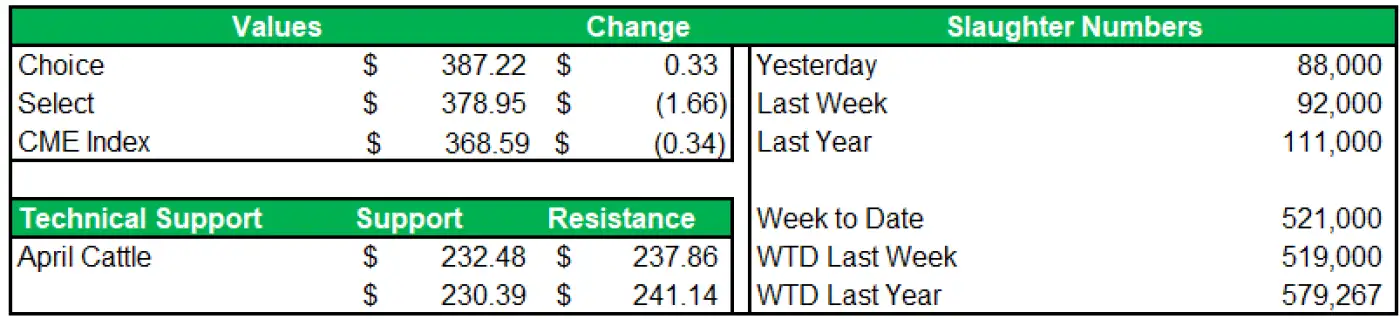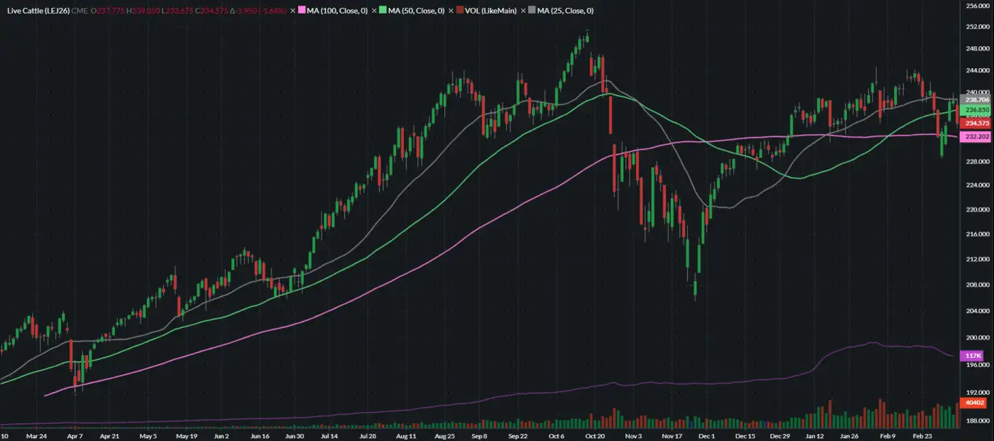 Live cattle futures ended the week sharply lower with April down $3.95 at $234.575 and Jun-Oct down $3.80 to $4.375.
