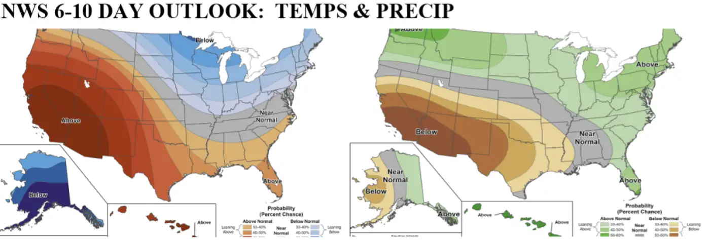 - Heavy rains fell across the center of the country over the weekend, dry in the Plains and WCB; another system is on tap mid-week, again favoring the SE belt and southeastern U.S. Extended maps have moved towards a wet north and dry center/south pattern, with temps only briefly dipping for the 6-10 day.