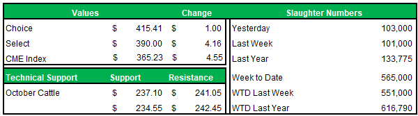 - Support was seen in the cutout which had choice gaining $7.50 for the week, and select gaining $6.34. Friday saw cutout values up $1 in the choice. It’s generally expected that wholesale beef prices will decline seasonally post-Labor Day.