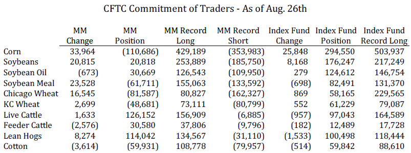 - Interesting action in the commitment of traders data, Covered some shorts up on the corn side of things, and soybeans increased their long.