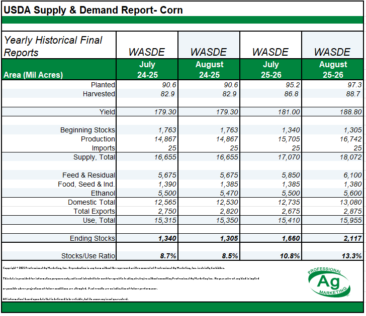- Yesterday we had a massive report on the August WASDE yesterday. USDA raised their corn yield to 188.8. Yet our ending stocks were only at 2.117 Billion bushels despite having a massive yield. The USDA bumped demand up, on feed and residual, and ethanol grind and also exports. Notably they also bumped the corn acres up a couple million.