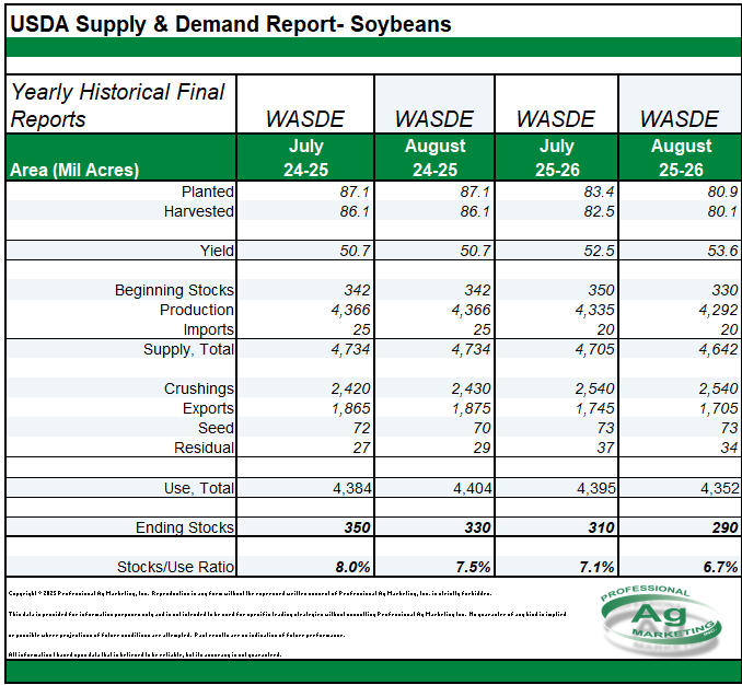- On the soybean side of things, we came at yield of 53.6 at the top end of trade range. Although we increased yield our ending stocks decreased. With our lack of export progress they decreased exports for 2025/26.