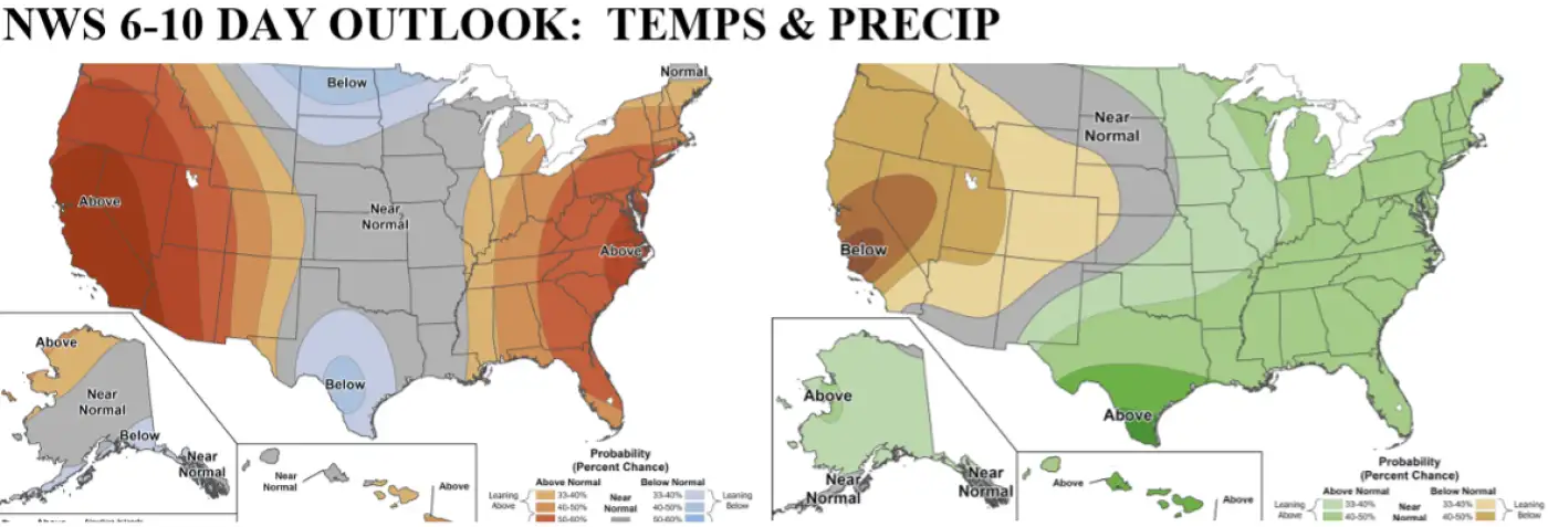 - Rains mostly cleared out over the weekend, and action lingers far north this morning, increasing throughout this week with precipitation holding above normal all the way into mid-April. Temperatures will move back closer to normal for the 6-10 day, back above-normal for the 11-15 day time frame.