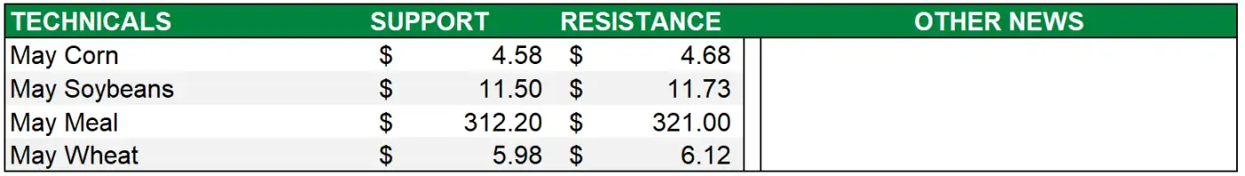Soybeans were sharply lower on Friday with front month May down $0.145 at $11.5925. The Jul-Nov contracts were down $0.0875 to $0.1425.